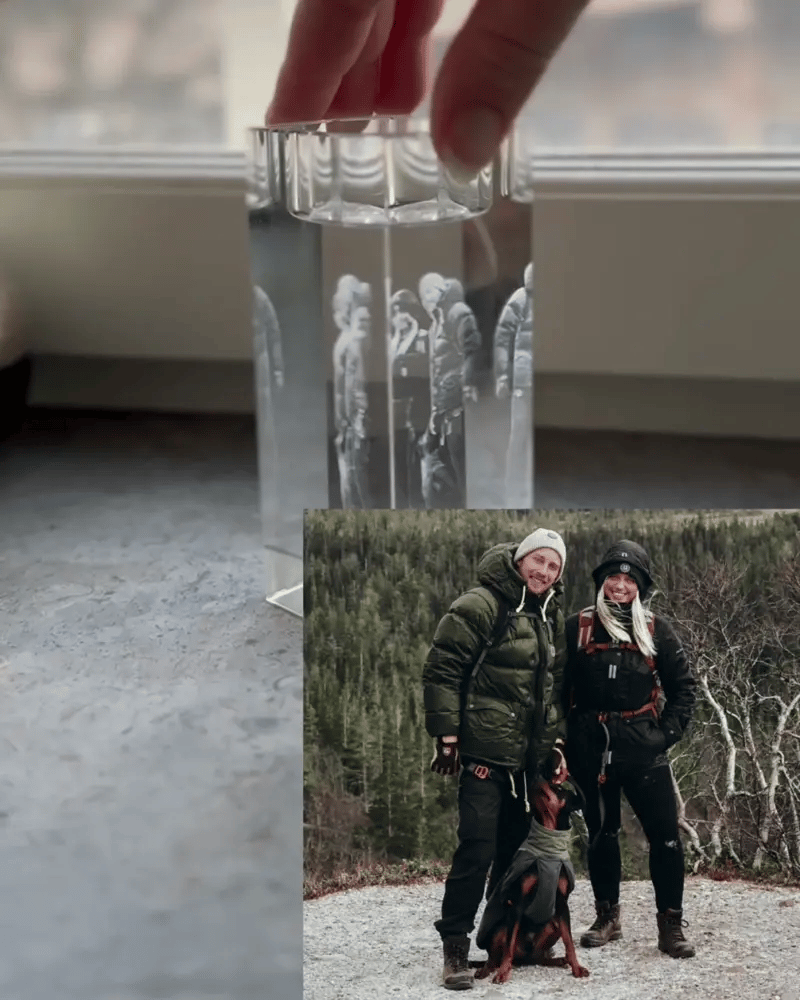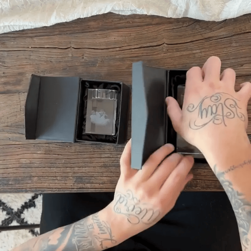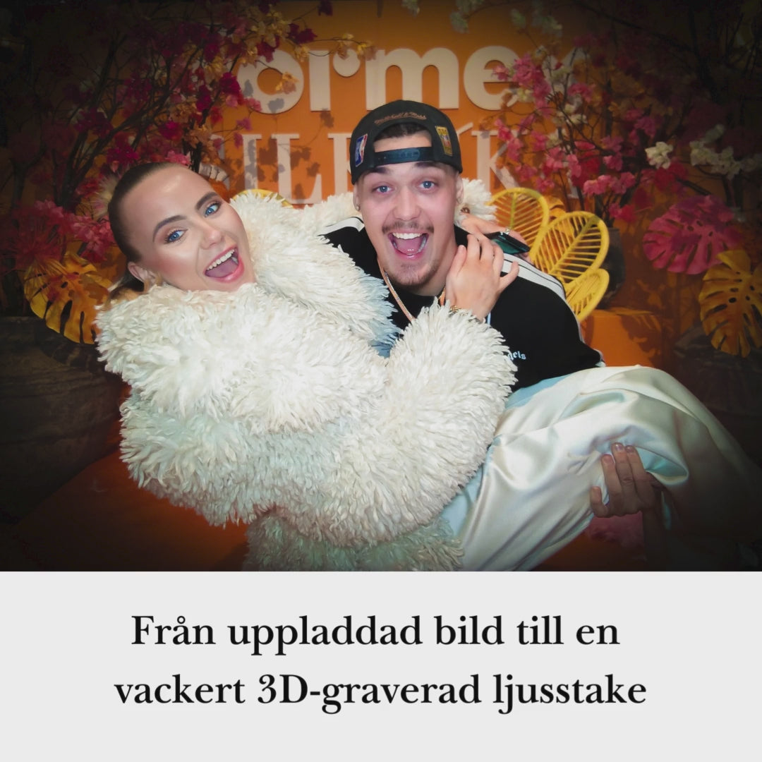 Edistyneen laserkaiverrustekniikan avulla valitsemasi valokuva muuttuu syväksi ja yksityiskohtaiseksi 3D-kaiverrukseksi läpinäkyvässä kristallimateriaalissa.